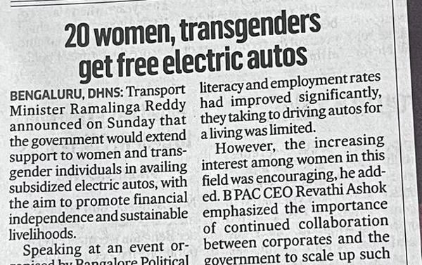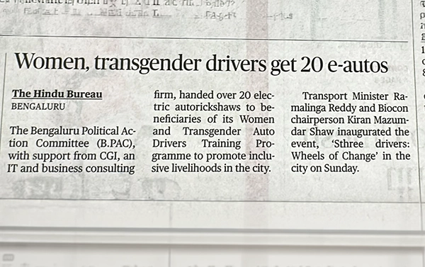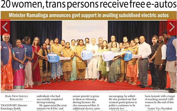 The Bengaluru Political Action Committee (B.PAC), in partnership with CGI, marked a significant milestone in its Women & Transgender Auto Drivers Training Program with a celebratory event in Bengaluru.